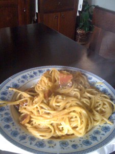 I was having a chat with Antonella yesterday at her grocery store and she mentioned she was making Spaghetti Carbonara for pranzo. We regularly talk about cooking and share recipes, so when she asked if I knew how to make a carbonara, I admitted I’d never attempted it. In the past the reason for this was a slight squeamishness about the egg at the end. But since I’m on quite the austerity plan at the moment, a recipe with only a few ingredients sounded just about right and I decided to try it. And it was so delicious, that now I have to share it!