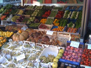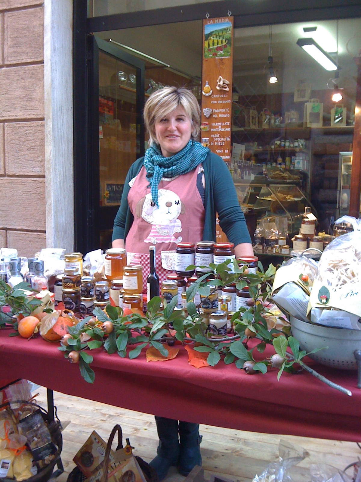 But today is gorgeous. Sunny skies and 70 degrees. Janet and I met up early this morning (okay 11:00 but that’s early for Janet who doesn’t have a Weimaraner who insists on 5:00 am) and we struck off to explore what was billed as a food market. In the end, it was much like the normal market that we see every Thursday. Don’t get me wrong it’s good stuff, scarves, jewelery, shoes, handbags, and tons of local cheese. But I had hoped for one or two stands with some nifty products from other parts of Italy that we don’t get here. Last year, there was a guy with dried cranberries and apricots, two things which are almost never found here. I bought a new tablecloth and the realized when I got it home that it is almost identical to the one I have!